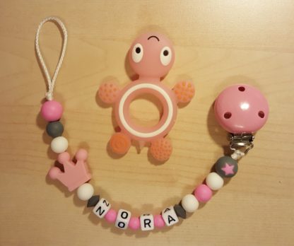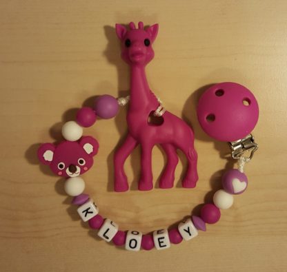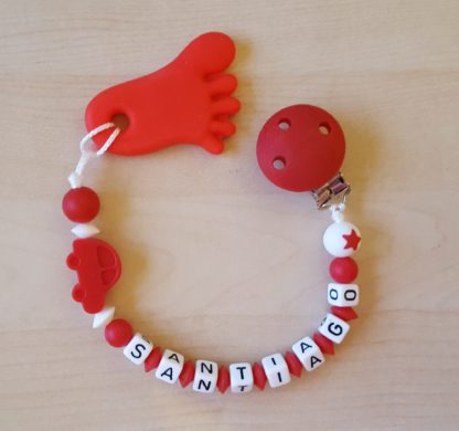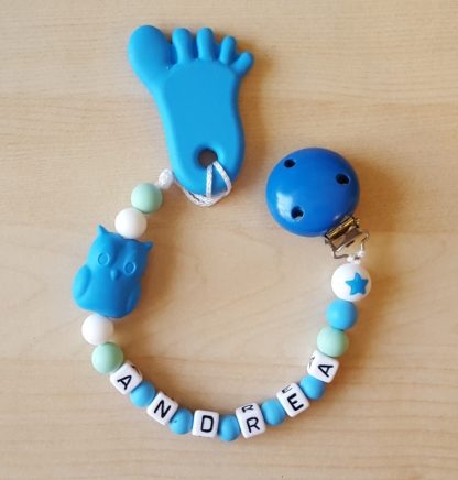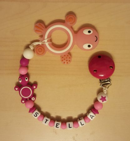 Attache dentition en silicone, avec ou sans prénom, divers couleurs et modèles à disposition.